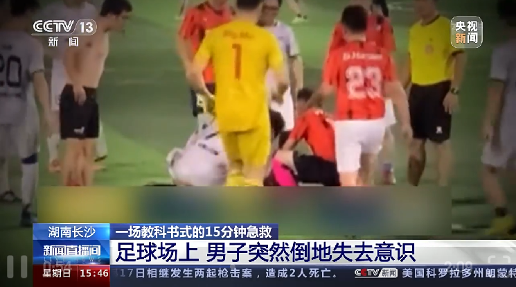 一場教科書式的15分鐘急救·湖南長沙:足球場上,男子突然倒地失去意識。